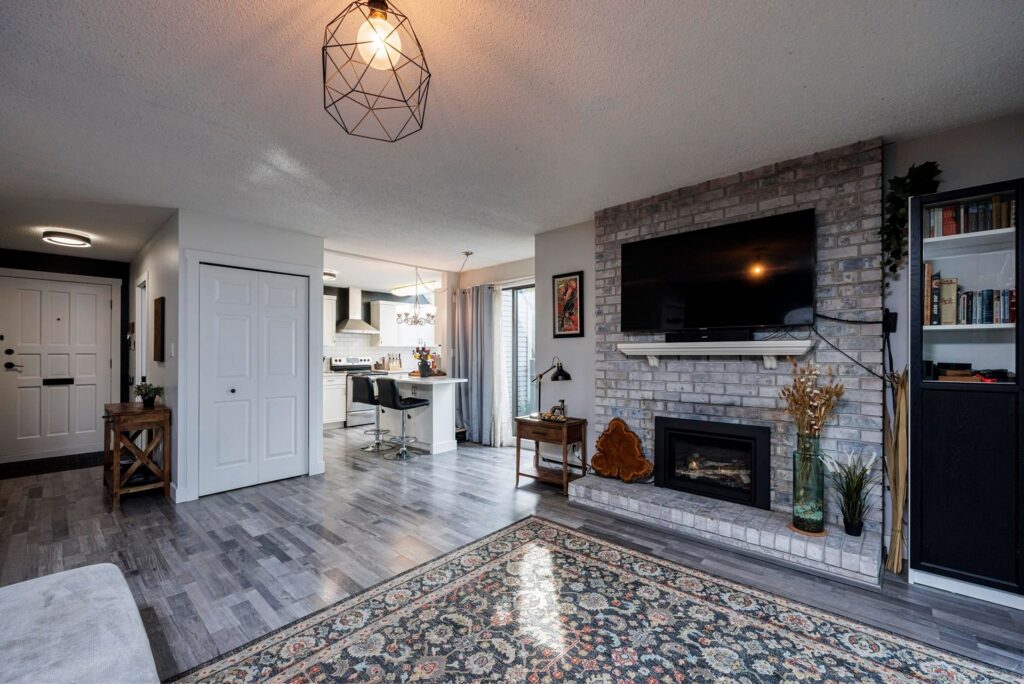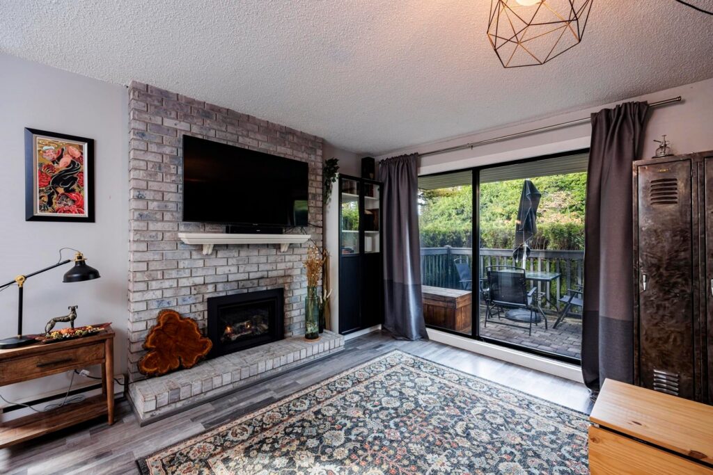 The open-concept living and dining area is anchored by a cozy gas fireplace and opens directly onto a private patio, ideal for BBQs, morning coffee, or relaxing after a long day. A refreshed powder room completes this level.